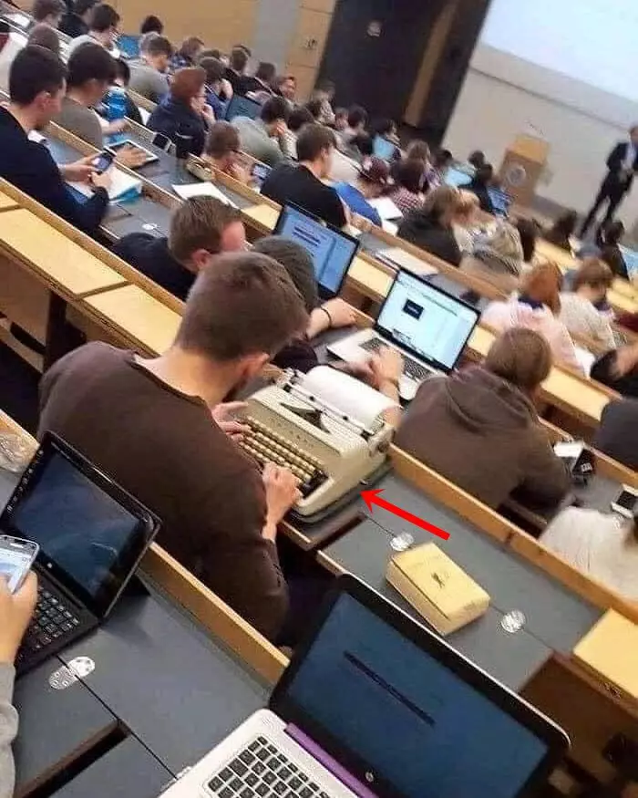 Di tengah laptop dan catatan digital, ada yang malah bawa mesin ketik jadul—anti-mainstream, nih!