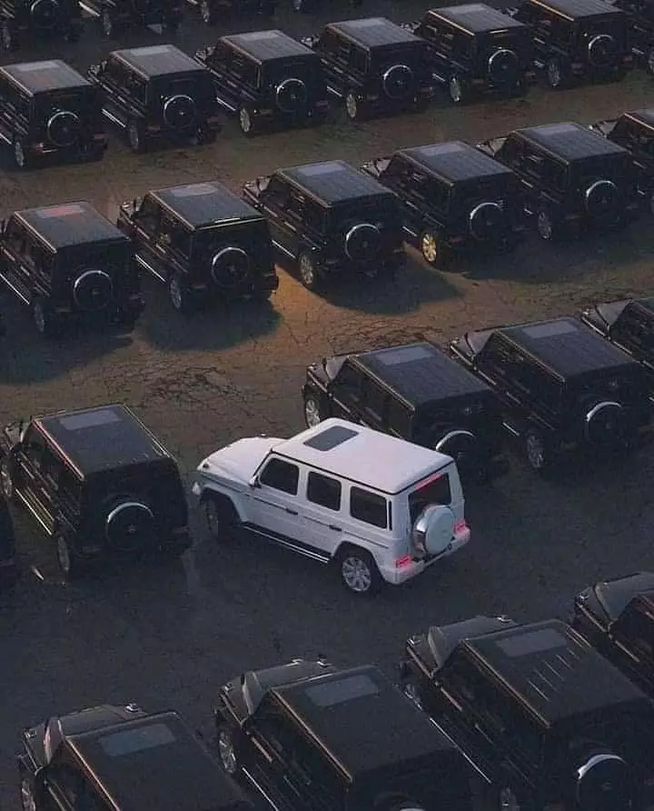 Deretan mobil serupa, tapi satu unit ini pakai warna super mencolok—selalu gampang dikenali.